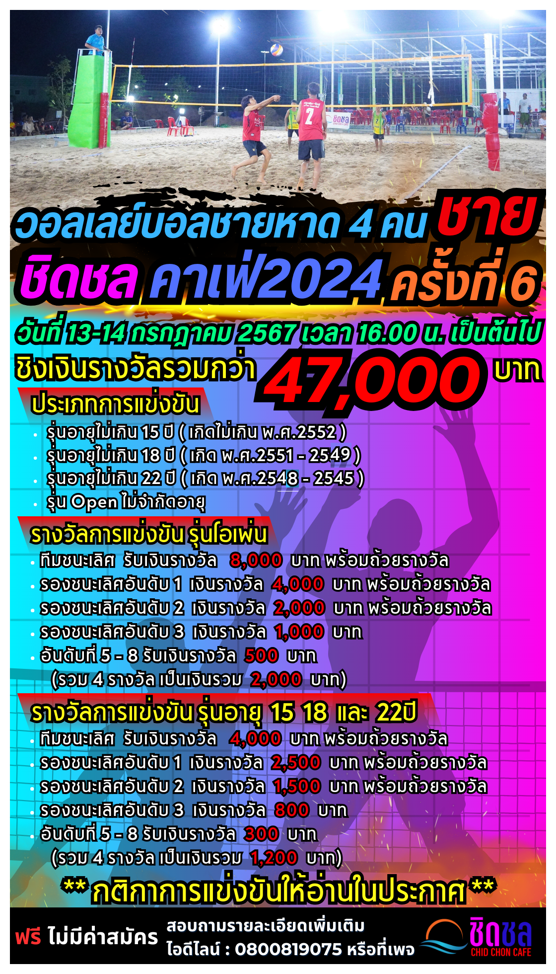 ประกาศรายชื่อทีมที่เข้าร่วมแข่งขัน “วอลเลย์บอลชายหาดชาย ชิดชล คาเฟ่ 2024 (Men’s Beach Volleyball Chid Chon Cafe 2024) ครั้งที่ 6”