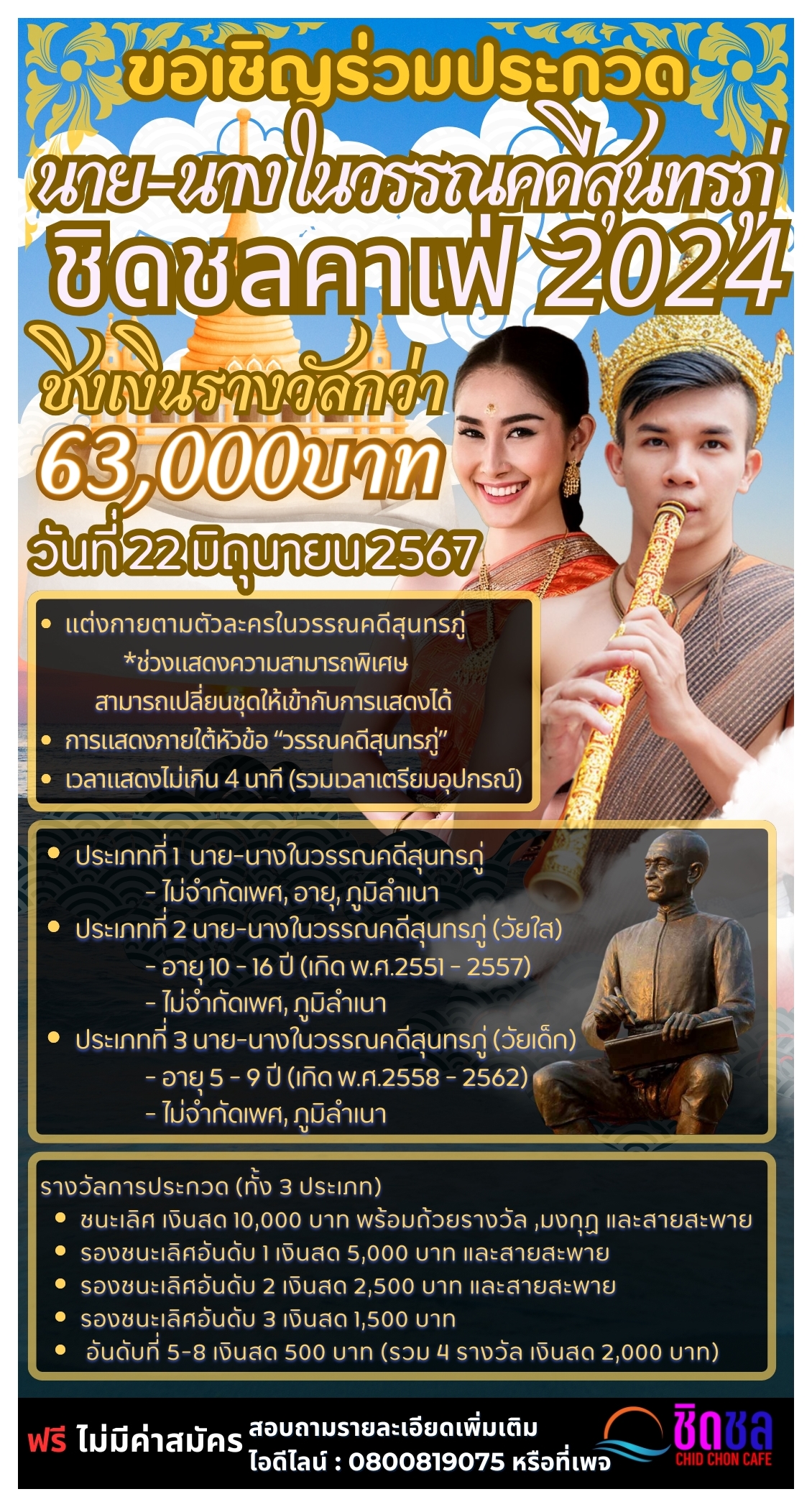รายชื่อผู้สมัครเข้าร่วมประกวด “นาย-นางในวรรณคดีสุนทรภู่ ชิดชลคาเฟ่ 2024” รวม 3 ประเภท ชิงเงินรางวัลรวม 63,000 บาท