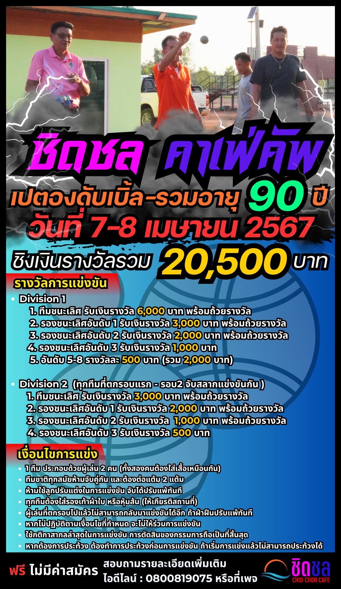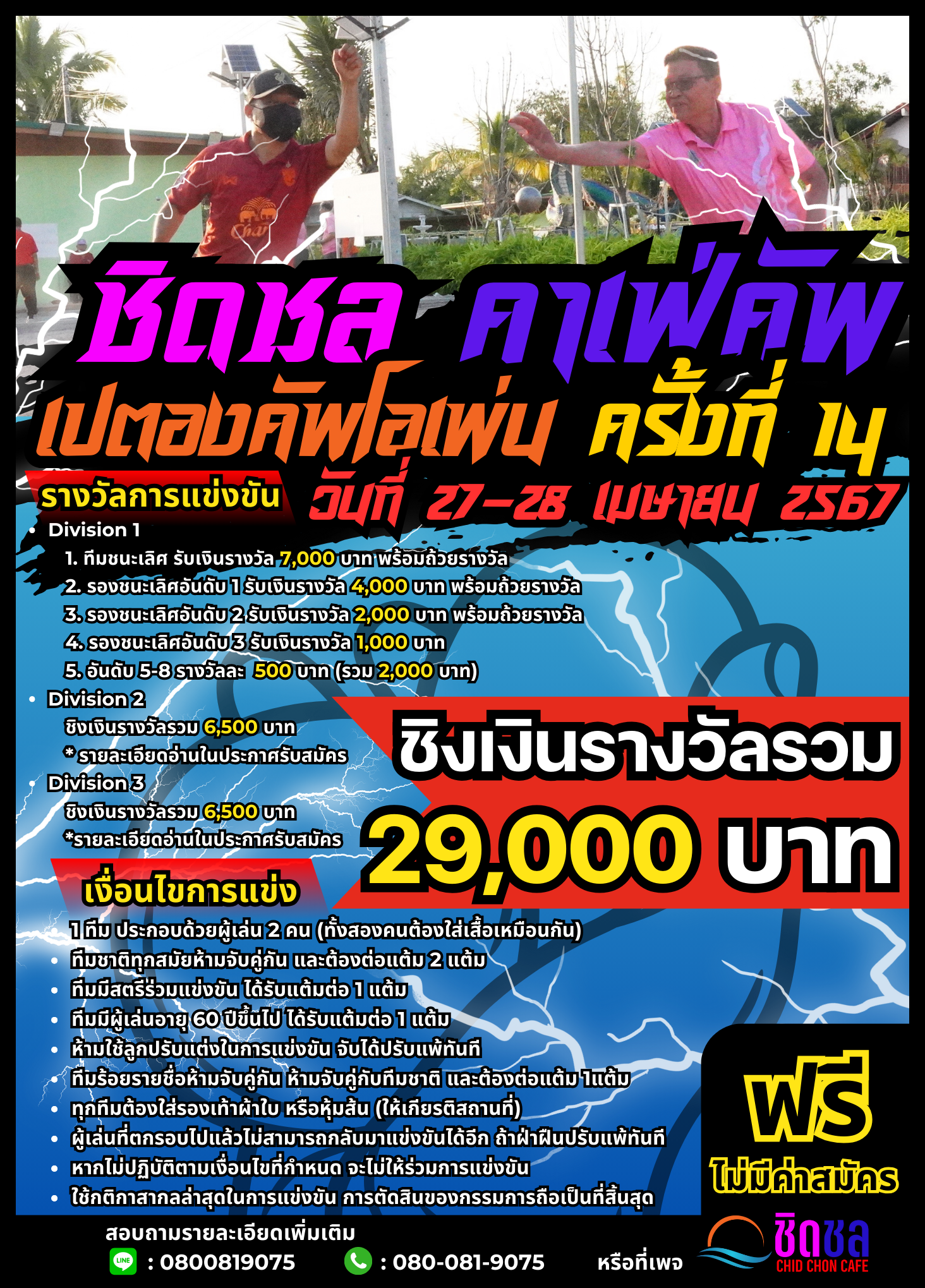 ประกาศรายชื่อทีมที่เข้าร่วมการแข่งขันเปตองดับเบิ้ล-โอเพ่น “ชิดชล คาเฟ่ เปตองคัพ ครั้งที่ 18” ชิงเงินรางวัลรวม 29,000 บาท